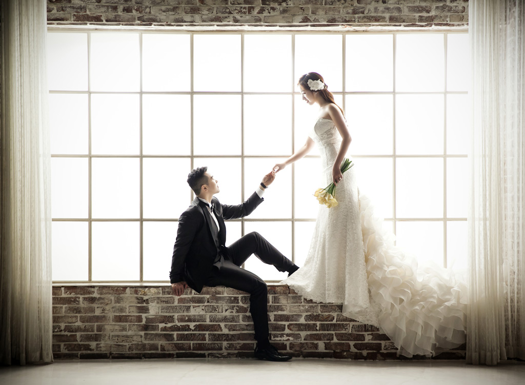 The classic windows shots are another kind of wedding photo theme that is a favorite of many couples. It is a necessary (필요한) shot of every wedding shoot as the cover page (표지) of the wedding album (앨범). It is so romantic when the sunlight (햇빛) shines through the window and makes the couple look dreamy and blissful. Meanwhile, the windows are usually long windows.
