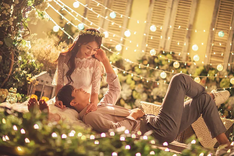 String lights has been quite a thing for young people these days due to the sentimental (감상적인) vibes it gives off. The background (배경) where the vertical string lights hang through the photos illuminates (비추다) the silhouette of the couple and creating a whimsical look. Grab a chance to try it out be it exposed or dim as both are dreamy.