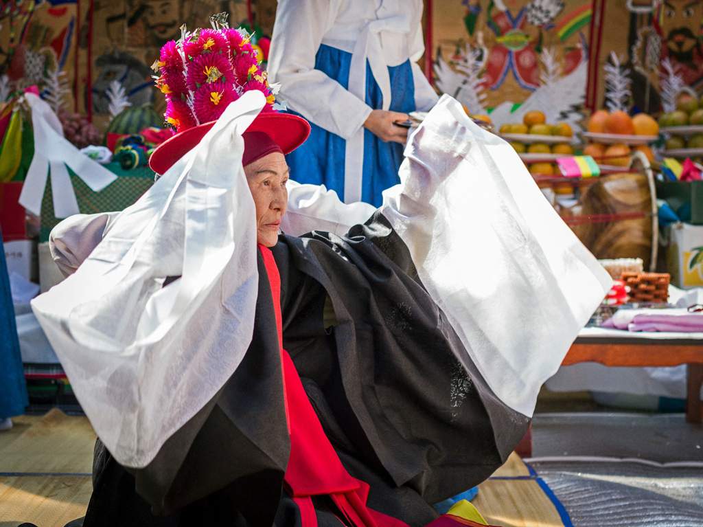 The gut (굿) is rites performed by Korean shamans involving offerings and sacrifices to gods and ancestors (조상님). They are characterised by rhythmic movements, songs, oracles and prayers. These rites are meant to create welfare, promoting commitment between the spirits and humankind. Through song and dance, the shaman begs the gods to intervene in the fortune of humans.