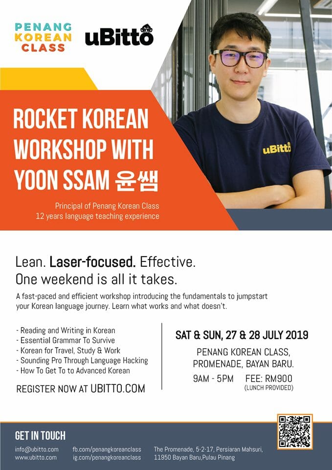 Penang Korean Class is having a Rocket Korean Workshop on the 27th-28th of July,2019. The purpose of this workshop is to help you speak the Korean language with confidence; whether you know the basics or even if you don’t!