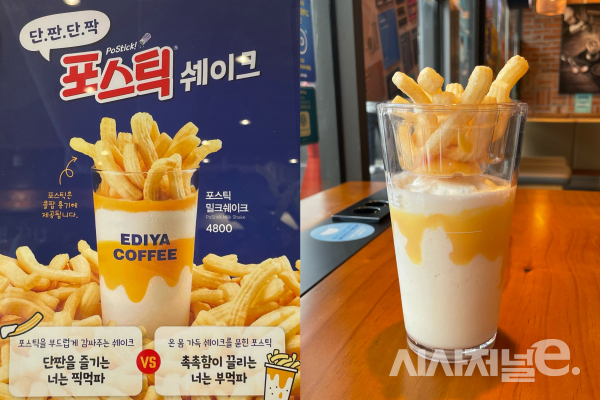 The Posticks stands for potato (감자) sticks. The Posticks is a snack combination (결합) of Ediya Coffee’s (이디야커피) origin milkshake topped with cheese sauce and Nongshim’s (농심) potato stick snack. It is suitable for those “dan-jjan“ (단짠) taste lovers which means sweet and salty combinations.