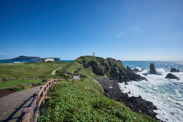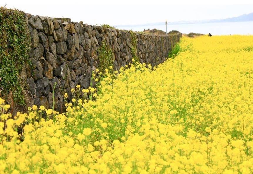 Seopjikoji is located at the edge of the eastern shore of Jeju Island. If you were to visit here in April, you will get the chance to see an amazing view of the yellow canola flowers in full bloom.