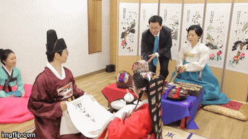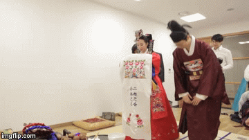 Finally, the ceremony is concluded with 대추 “daechu” (jujube) and chestnuts being thrown back at the bride, who tries to catch them with her wedding skirt.