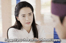 You may be familiar with the honorifics “noona” (which a boy uses to address an older girl) and “oppa” (used by girl to address an older boy), but in 사극, Saeguk you’ll hear the old-fashioned term, “누이” (nu-i) and “오라버니” (“orabeoni”).