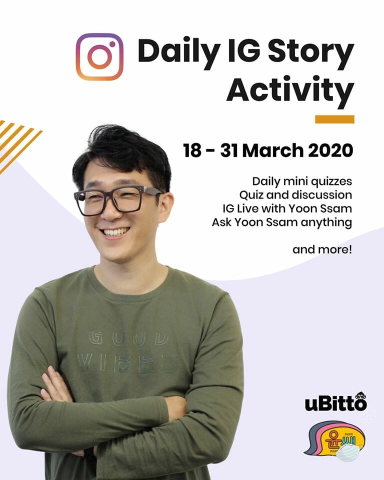 There will be different activities posted daily in various forms to help you learn or practise Korean on Instagram stories. There will be simple daily quizzes, discussions, IG live sessions with Yoon Ssam and more! You can also ask Yoon Ssam about anything and he will personally answer your questions.