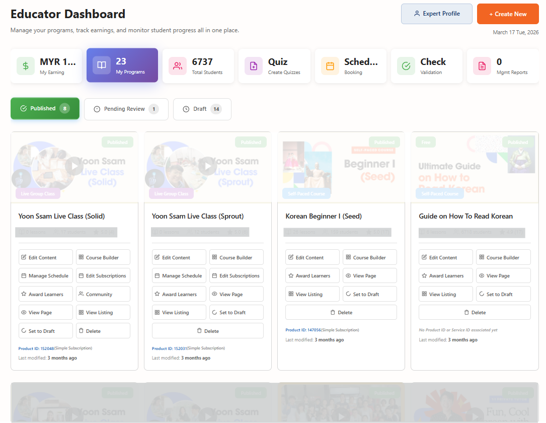 20,000+ learners are on uBitto looking for structured Korean programs right now. They discover your course, enroll, and pay — all automatic. 10 students × $50 = $500 from one program.