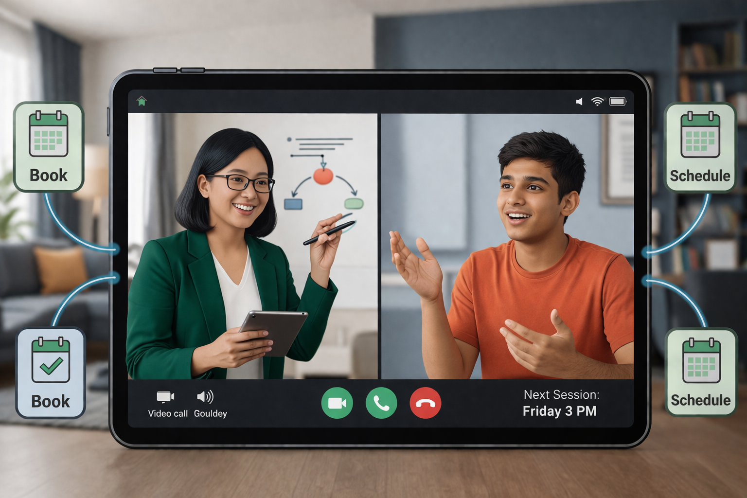 - Book live sessions flexibly — when you're free, not fixed